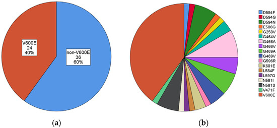 Summary of identified BRAF mutations. (a) V600E vs. non-V600E; (b) V600E and all other non-V600E mutations.