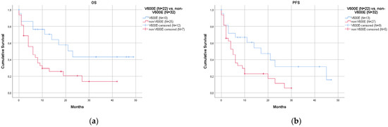 Survival curves comparing V600E and non-V600E mutations. Cases with V600E mutations (22 cases, blue lines) showed better prognosis than those with non-V600E mutations (32 cases, red lines): (a) overall survival (OS) (p = 0.008); (b) progression-free survival (PFS) (p = 0.018).