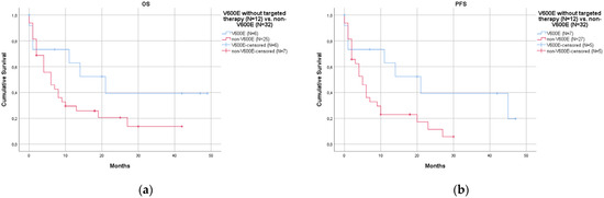 Survival curves comparing V600E and non-V600E mutations without targeted therapy. Targeted therapy may be used in BRAF-mutated patients, especially in those harboring V600E. Without targeted therapy, cases with V600E mutations (12 cases, blue lines) exhibited a better prognosis than cases with non-V600E mutations (32 cases, red lines): (a) overall survival (OS), without statistical significance (p = 0.103); (b) progression-free survival (PFS), with statistical significance (p = 0.036).