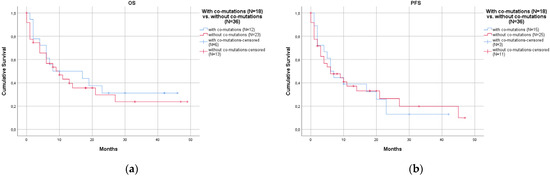 In contrast, co-mutations did not affect prognosis, neither in terms of OS (p = 0.590, Figure 4a) nor PFS (p = 0.938, Figure 4b). The median OS was 8 months in 18 cases with co-mutations (95% CI 0–27.6) and 10 months in 36 cases without co-mutations (95% CI 3.7–16.3). The median PFS was 6 months in 18 cases with co-mutations (95% CI 3.2–8.8) and 6 months in 36 cases without co-mutations (95% CI 0–12.8).