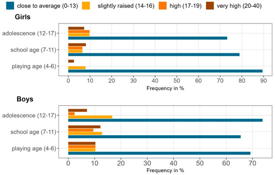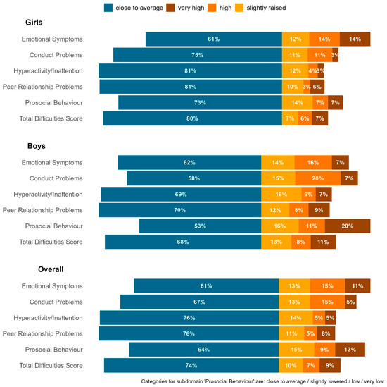 When the data were stratified by sex, clear differences emerged. Boys showed higher deficits in all categories except emotional problems. This difference was most pronounced in the area of prosocial behaviour, where boys had twice as many deficits (31% ranging from high to very high) as girls (14% ranging from high to very high). In the category of emotional problems, girls had twice as many emotional deficits (14% in the very high range) compared to boys (7% in the very high range).