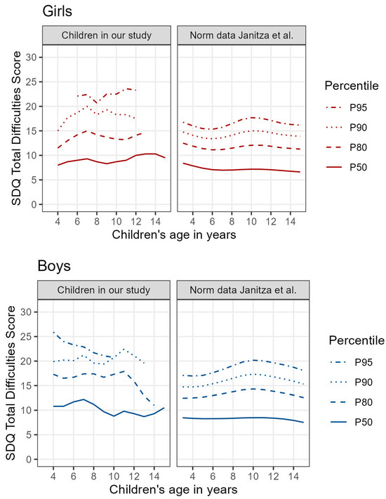 In our study, there is a clear sex difference in the progression of the percentile curves over the age of children (Figure 3). While girls showed increasing total difficulties scores with increasing age, boys showed high scores in their younger years that decreased with increasing age. This effect is not found in the normal population of the same age by Janitza et al. [15]. In our study cohort, 10% of the boys and 5% of the girls of all ages had scores above 20 points on the total difficulties score, meaning they were very severely and more distressed than the comparison group.