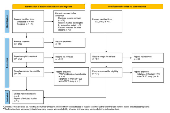 Figure 1. Preferred Reporting Items for Systematic Reviews and Meta-analysis flow diagram of the study selection. PARP = poly (ADP-ribose) polymerase; mCRPC = metastatic castration-resistant prostate cancer; ASCO-GU = American Society of Clinical Oncology Genitourinary Cancers Symposium. From Ref. [24]. For more information, visit: http://www.prisma-statement.org/ (accessed on 18 October 2023).