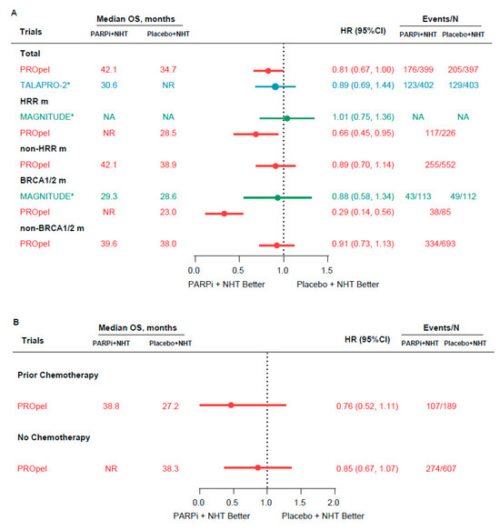 Figure 3. Forest plot of OS for patients receiving the combination and standard-of-care therapies. (A) OS for biomarker-unselected and biomarker-selected patients; (B) OS for subgroup stratified by prior taxane-based chemotherapy in the mCSPC setting. OS = overall survival; NR = not reached; NHT = novel hormonal therapies; PARPi = poly (ADP-Ribose) polymerase inhibitors; HRR = homologous recombination repair; HRR m = HRR mutation; BRCA1/2 m = BRCA1/2 mutation; N = number; NA = no data; HR = hazard ratio. * Immature data.