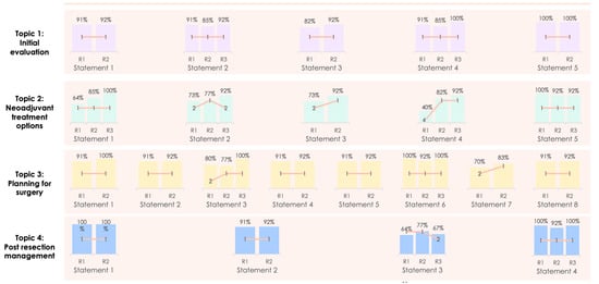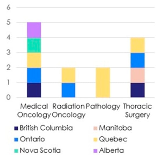 Once the recommendations had been developed, an online modified Delphi process was conducted during which the statements were sent independently to a committee of eleven published and recognized experts from across Canada within the fields of thoracic surgery, medical and radiation oncology and pathology, as shown in Figure 1. Due to different training paradigms and practice patterns in Canada, several of the thoracic surgeons (BK, AM) also had expertise in interventional pulmonology domains (high volume EBUS, primary involvement in diagnosis and staging patients with lung cancer). The Delphi panel members and expert panel (except JT) were invited via secure institutional e-mail to anonymously rate the recommendations using a Likert score (1—extremely agree, 2—agree, 3—neither agree nor disagree, 4—disagree and 5—extremely disagree) and submit free-text comments to an expert reviewer (JT). Recommendations were updated iteratively based on Delphi panel feedback before the next round of voting. The remaining members of the expert working group were blinded to the process of statement modification.