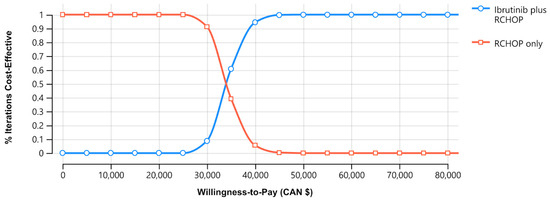 Probabilistic analyses of 10,000 simulations demonstrated that, for a willingness to pay (WTP) threshold of CAD 100,000/QALY, based on the 30-year horizon, the addition of ibrutinib to RCHOP chemotherapy in younger patients with ABC-DLBCL was more cost-effective (Figure 1) [45].