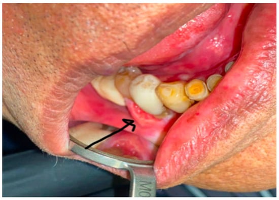 Pretreatment photograph of patient #2: arrow points to exophytic gingival mass between the two right mandibular premolars in the site of biopsy-proven squamous-cell carcinoma.