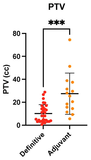 PTV of brain metastases undergoing definitive (red) vs. adjuvant (orange) SRT. *** p < 0.001, Mann–Whitney test. PTV: planning target volume; SRT: stereotactic radiotherapy.