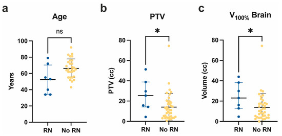 Characteristics of patients developing RN. Age (a), PTV of brain metastases (b), and brain V100% (c) of patients developing (blue) vs. not developing (yellow) RN after SRT with 5 × 7 Gy. * p < 0.05; ns: not significant (p ≥ 0.05); Mann–Whitney test. PTV: planning target volume; RN: radiation necrosis; SRT: stereotactic radiotherapy.