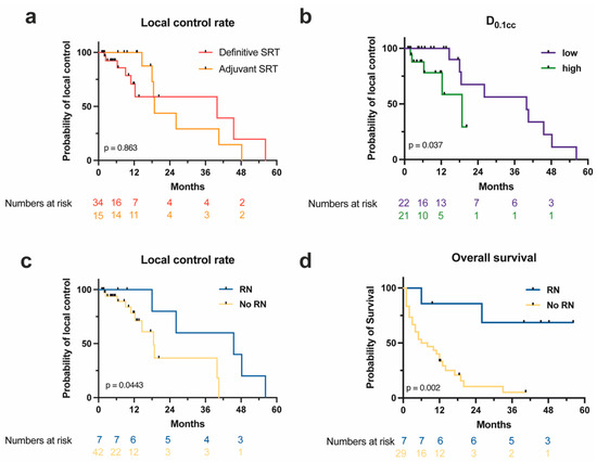 Local control and survival depending on patient characteristics. (a) Local control rate over time in months for definitive (red) and adjuvant (orange) SRT with 5 × 7 Gy (Log-rank test). (b) Local control rate over time in months for low (purple) vs. high (green) PTV D0.1cc in FSRT with 5 × 7 Gy (Log-rank test). (c,d) Local control rate (c) and overall survival (d) over time in months of patients developing (blue) vs. not developing (yellow) RN after SRT with 5 × 7 Gy (Log-rank test). PTV: planning target volume; RN: radiation necrosis; SRT: stereotactic radiotherapy.