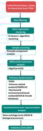 LUAD TCGA RNA-seq data are publicly available from (http://gdac.broadinstitute.org/ data status of 28 January 2016). For validation, gene chip GSE12667 of LUAD with its clinical manifestation data was also downloaded from the Genome Expression Omnibus (GEO) database, available from https://www.ncbi.nlm.nih.gov/geo/ accessed on 21 March 2021. Supplementary data from our analyses are also available in the Supplementary Materials.