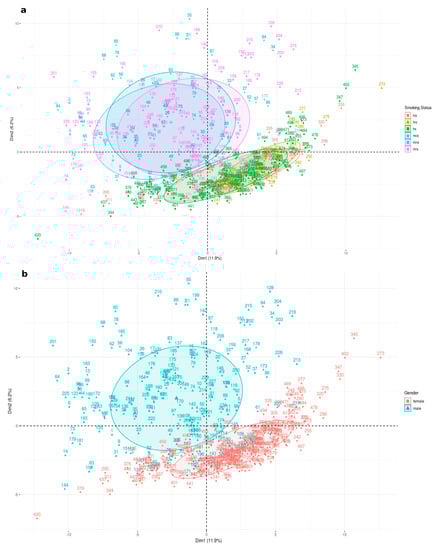 Principal component analysis performed on expression data for 161 genes for all 6 LUAD subgroups. Subgroups clusters are represented on the factorial plane by coloured ellipses reflecting their association with 11.9% and 6.2% of the total variability for the first two dimensions.  (a) represents all six groups: male never smokers (MNS), current smokers (MCS), female never smokers (FNS) and female current smokers (FCS), while  (b) represents males and females collectively.
