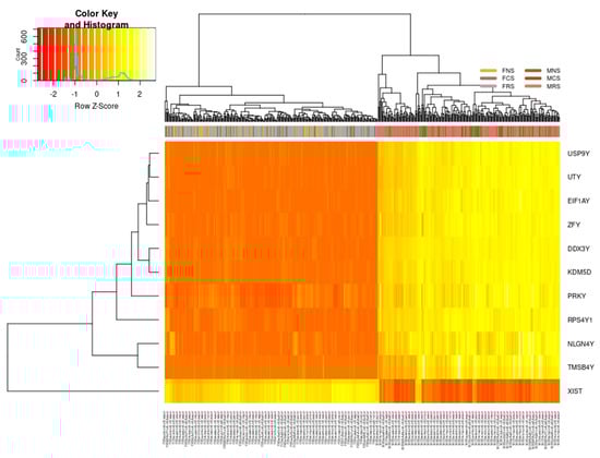 Regardless of smoking status, stage or age, we identified 11 DEGs in our cohort that differ in their expression pattern between females and males (Figure 3). These differences are the result of sexual differentiation involving genetic and epigenetic mechanisms. USP9Y, UTY, EIF1AY, ZFY, PRKY, NLGN4Y, TMSB4Y, DDX3Y, KDM5D and RPS4Y1 were all upregulated in males (MNS, MCS, MRS) with significant fold changes log2FC > 6 and only XIST downregulated in females (FNS, FCS, FRS) with significant fold changes log2FC < −5. We confirmed that these 11 genes differentiate both sexes in relation to LUAD carcinogenesis also by verifying whether other X- or Y-linked genes, termed “control genes”, demonstrate a similar pattern (Supplementary Figure S2). We did not find a difference in expression of these “control” genes between the two phenotypes, thus confirming specificity in regard to LUAD rather than a general sex-specific difference.