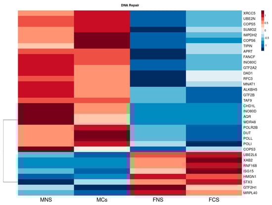 Heatmap reflecting the differential median expression across all the samples using the DNA repair DEGs in LUAD cohort between male never smokers (MNS), current smokers (MCS), female never smokers (FNS) and female current smokers (FCS).
