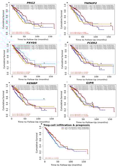 Overall survival analysis for combining the expression of single DEGs and Tregs in LUAD patients. (a) PRG2, (b) TNFAIP2, (c) FXYD5, (d) FCER2, (e) RENBP, (f) GIPR, (g) relationship between Treg-cell infiltration and prognosis of LUAD according to sex based on Quantiseq algorithm. (*) indicates p-value < 0.05 was considered statistically significant.