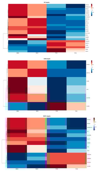 Heatmap reflecting the differential median expression across all the samples according to DEGs encoding androgen and oestrogen transcriptional target in LUAD cohort between male never smokers (MNS), current smokers (MCS), female never smokers (FNS) and female current smokers (FCS).