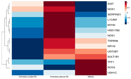 Heatmap reflecting the differential median expression across all the samples, illustrating the individual genes that are differentially expressed between premenopausal (under 55 years of age), postmenopausal females (over 55 years of age) and males.