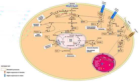 A graphical summary of some DEGs along with the metabolic processes they are involved in. Red denotes DEGs with elevated expression in females and blue denotes DEGs with elevated expression in males.