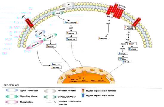 Tumour cells in the TME outcompete T cells for glucose, which leads to sustained mTOR signalling, glycolysis and proliferation [], as observed in our female cohort. On the contrary, downregulation of mTOR by enhanced glucose consumption results in chemokine secretion, which impairs T cells’ metabolic reprogramming and facilitates tumour immune escape []. We found overexpression of FCER2, FXYD5, HMHA1 and RENBP to correlate with better prognosis in males, whereas, in females, higher expression of GIPR, PRG2 and TNFAIP2 correlates with better prognosis. In our female cohort, through MAPK signalling, higher expression of MAPK1/3 could result in anergy via JUN, which is reported to occur in T cells infiltrating tumours. A similar response occurs following overexpression of RELA and MAPK11 and NFATC1/2. Additionally, following indirect JUN activation via EGFR or MAPK1/3, it could result in angiogenesis and immune response. MAPK1/3 and RELA seem to be major players in inflammatory immune response in our female cohort following cytokine receptor interaction of CX3CL1 with CXCR5. We speculate this chemokine signal could correlate with tumour-infiltrating lymphocytes as a cancer immune evasion mechanism against immunosurveillance following altered Warburg effect, whereby glucose consumption and oxidation are dysregulated, enabling rapid proliferation [].
