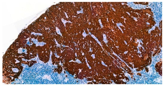Formalin-fixed paraffin-embedded blocks of tumor specimens were analyzed for IHC of p16, CD8, and PD-L1. Paraffin-embedded tumor sections were deparaffinized and incubated with monoclonal antibodies. IHC of p16 was performed using a mouse monoclonal primary antibody against p16INK4a (CINtec® Histology, Ventana, AZ, USA) (Figure 1). The positive expression of p16 was interpreted with strong and diffuse nuclear and cytoplasmic staining (block staining) ≥ 70% of tumor cells [22].