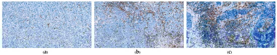 Immunohistochemical staining for CD8 (100×). (a) CD8 ≥ 1% but < 5%; (b) CD8 ≥ 5% but <10%; (c) CD8 ≥ 10%.
