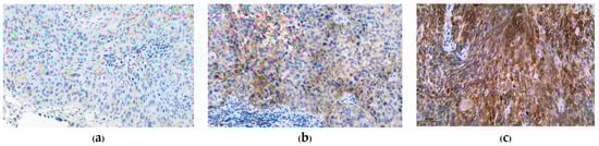 Immunohistochemical staining for PD-L1 (200×). (a) CPS ≥ 1 but < 20 with weak intensity (1+); (b) CPS ≥ 20 with moderate intensity (2+); (c) CPS ≥ 20 with strong intensity (3+).
