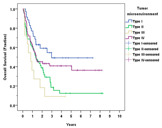 The patients were classified into four groups according to the TME as follows: type I (PD-L1+/TIL+, adaptive immune resistance) 35 (22.2%), type II (PD-L1−/TIL−, immunological ignorance) 48 (30.4%), type III (PD-L1+/TIL−, intrinsic induction) 11 (7.0%), and type IV (PD-L1−/TIL+, tolerance) 64 (40.5%). The OS differed significantly between the four types (p = 0.004). The group with the best survival outcome was type I, followed by type IV, II and III, respectively. The Kaplan–Meier analysis of the TME types is shown in Figure 5.