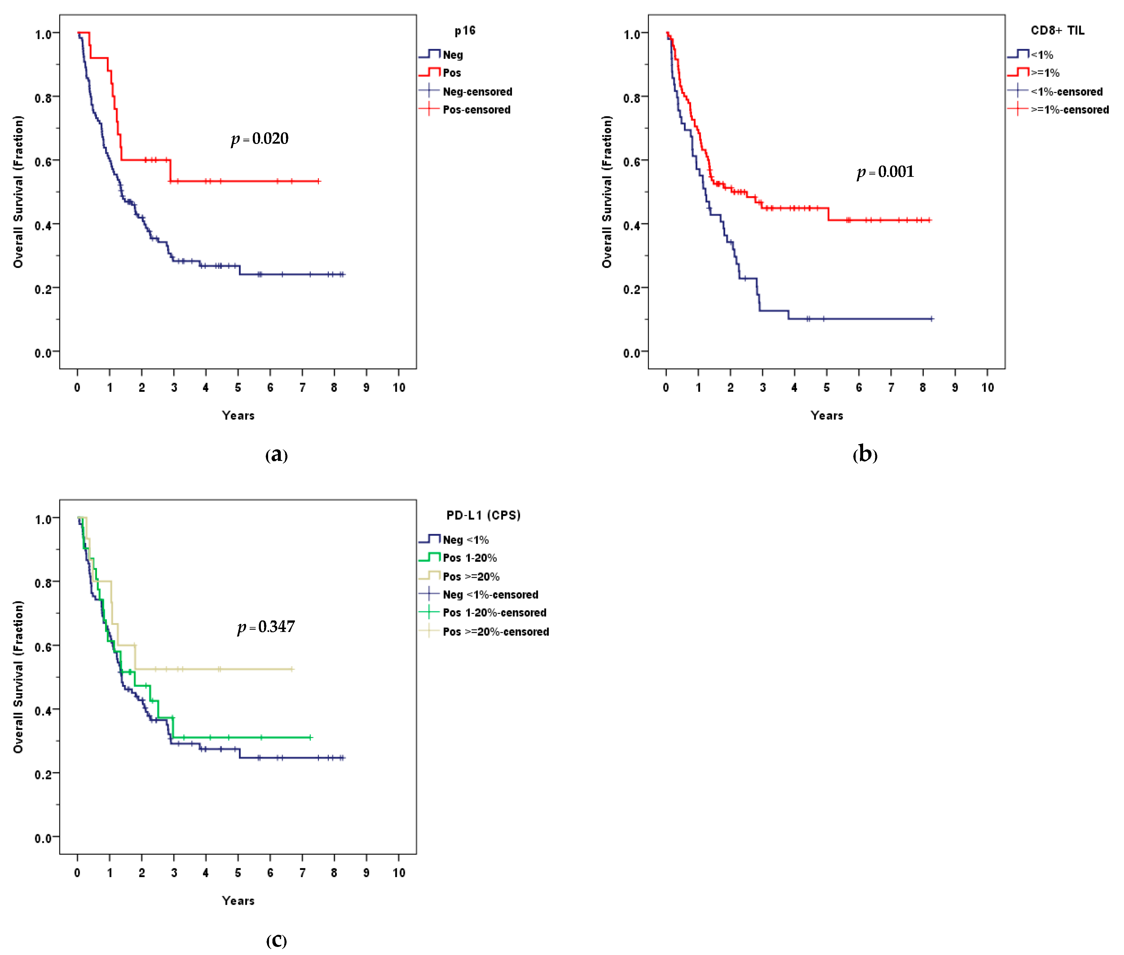 - De Meulenaere, A.; Vermassen, T.; Aspeslagh, S.; Deron, P.; Duprez, F.; Laukens, D.; Van Dorpe, J.; Ferdinande, L.; Rottey, S. Tumor PD-L1 status and CD8(+) tumor-infiltrating T cells: Markers of improved prognosis in oropharyngeal cancer. Oncotarget 2017, 8, 80443–80452. [Google Scholar] [CrossRef]
