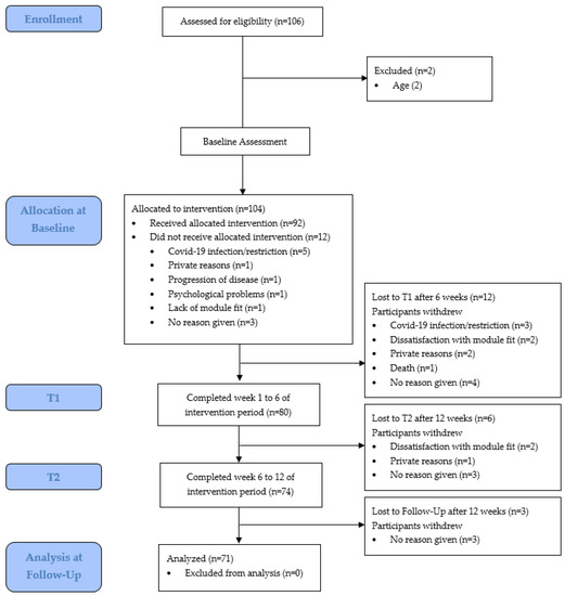 From September 2020 to April 2021, 106 young adults contacted us regarding participation in YOUEX across all social media platforms which were deployed for recruitment. One-hundred and four of those met the inclusion criteria and 92 patients confirmed the letter of consent and started at baseline (T0). Figure 1 shows the flow diagram from enrollment to analysis including the number of and reasons for dropouts.