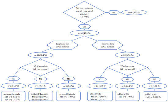 Eighty from ninety-two participants completed the first 6 weeks of intervention and reached the first time point of intervention (T1). At T1, 43% (n = 34) of participants replaced or amended their initial module (see Figure 2). Eleven participants (14%) replaced their initial module, of which 55% (n = 6) chose M2, 27% (n = 3) chose M3 and 18% (n = 2) chose M1. Twenty-three participants (29%) amended the initial module of which thirteen patients added M2 to M1 (57%), six patients added M1 to M2 (26%), three patients added M2 to M3 (13%) and one patient added M3 to M1 (4%). Reasons for replacing or amending the group-based online exercise program (M1) were the wish to increase activity through adding another module (33% of 39 given answers) and the wish to receive more individual advice by an exercise therapist (26% of 39 given answers). YAs who chose the online-training-app (M2) (a total of 44 qualitative answers were given) named the wish for more interaction with trainers (27%), problems with COVID-19 restrictions (23%) and that they wanted to try another module (14%) as reasons for replacing or amending the initial module. The most common reason for replacing M3 (a total of 7 qualitative answers given) was COVID-19 restrictions (43%). Seventy-four from eighty participants reached the T2 (12 week) time point and the end of the main exercise intervention. Between T1 and T2, 71% took part in one module and 29% took part in two different modules.