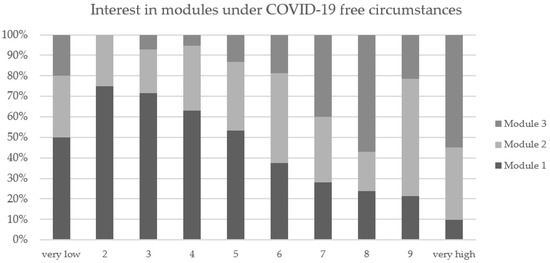 Interest in different modules under COVID-19-free circumstances on a scale of 1 (very low interest) to 10 (very high interest).
