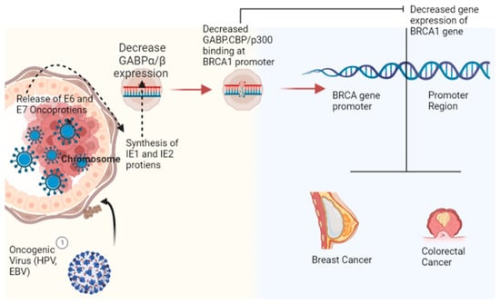 Role of viral oncogenic proteins in the progression of the most common type of cancers (breast cancer and colorectal cancer) with particular emphasis on the BRCA1 gene (Image created by biorender.com, accessed on 2 November 2022).