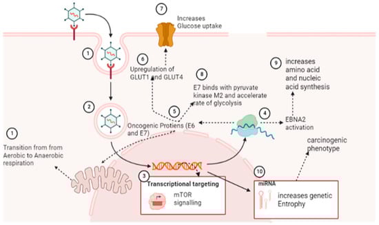 Through the activation of EBNA2, which triggers a myc-dependent metabolic program to increase amino acid and nucleotide synthesis, EBV infection promotes the adhesion and proliferation of B cells []. Viral infections also accelerate lipid metabolism, which is necessary for the de novo synthesis of new cells. In addition to increasing the production of proteins and nucleic acids, miRNAs of KSHV alter the metabolic pathways of cancerous cells from oxidative phosphorylation to glycolysis []. From these findings, it can be postulated that cancerous viruses cause alteration in cellular metabolic pathways by targeting multiple sites of metabolic pathways (Figure 3) [].