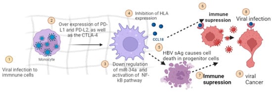 Evolutionarily, the survival of predatory viruses and cancerous cells is only possible in an immune-compromised environment. Viral cancers are found to increase in an immune-compromised state induced by alterations and modulations of immune response by virus and their metabolites []. Oncogenic viruses cause upregulation of hotspots involved in immunosuppressive pathways by causing over-expression of PD-L1 and PD-L2, as well as the CTLA-4 [] (Figure 4). In addition to this, a diverse set of viral components have been found to act on immunosuppressive pathways. These include: (i) downregulation of miR-34a, a prerequisite for the synthesis of PD-L1 [] (ii) activation of NF-kB pathway by PD-L1 [] (iii) inhibition of HLA expression by viral oncogenic proteins, which results in diminished recognition of tumor cells by the immune system and ineffectiveness of immunotherapy [] (iv) Similarly, HBVsAg causes cell death in progenitor cells responsible for the production of various types of immune cells which further causes conditions favorable for carcinogenesis []. Similarly, viral oncogenic core proteins bind with host cellular gC1qRthatinhibits recruitment of immune cells towards cancerous cells and function as an efficient disabling mechanism of immune cells to cause viral and cancerous clearance [].