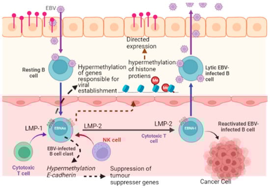 - Fujii, T.; Okabe, A.; Kaneda, A. Epigenetic contribution to tumorigenesis of host cells by Epstein-Barr virus infection. Chiba Medical. J. 2022, 98, 1–7. [Google Scholar]