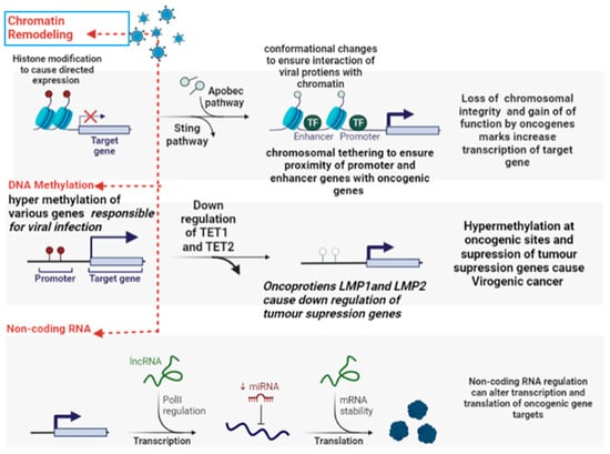 Oncogenic Viral infection can cause epigenetic reprogramming through a diverse set of mechanisms by acting on various hotspots. For instance, the following epigenetic reprogramming pathways have been identified in viral cancers, including (i) Hyper- methylation of various genes responsible for establishing viral infection (HPV and EBV carcinomas). (ii) Hypermethylation results in the down-regulation of TET1 [] and TET2, which are actively involved in demethylation at the deleterious site on the host genome (Figure 6). (iii) The activation of DNMT1 by viral oncoproteins (LMP1 and LMP2) results in hypermethylation at the CDH1 (E-cadherin) promoter region, which in turn results in the downregulation of tumor suppressor genes (p16 and p21) []. (iv) Various viral oncoproteins cause structural and functional modification in histone proteins and hence directed expression of genes, especially Sting [] and Apobec [] pathways (v). Oncogenic viruses cause conformational changes in chromosomal architecture that leads to reorganization of DNA loops to ensure effective interaction of viral oncogenic proteins with the genomic framework. (vi) Oncogenic viruses cause chromosomal tethering, which decreases the proximity of the promoter region with the exon region and causes the transition of heterochromatic DNA into euchromatic DNA, which results in the opening of genomic territories and hence causes activation of cancer-related genes [].