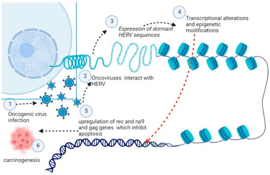 Activation of dormant HERV determinants induced by oncogenic viruses’ which cause transcriptional, post-transcriptional, and epigenetic modification in the host cell for its transition into a cancerous cell (Image created by biorender.com, accessed on 2 November 2022).