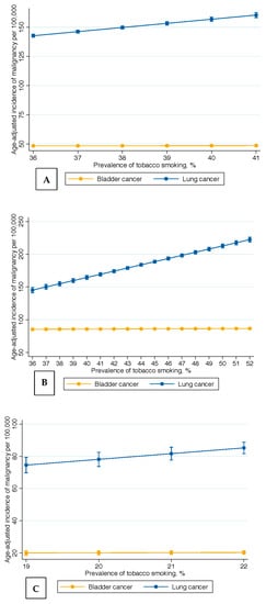 Among women, the increasing trend in the prevalence of tobacco smoking was significantly associated with the trend in the incidence rate of lung cancer (IRD: +3.55; 95%CI: +3.12; +3.99; p < 0.001, Figure 2C), but not with the trend in the incidence rate of bladder cancer (IRD: +0.12; 95%CI: −0.01; +0.25; p = 0.06, Figure 2C).