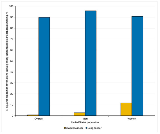 Proportions of variations in bladder and lung cancer incidence related to tobacco smoking exposure in the overall, male, and female United States populations over the past-half century.
