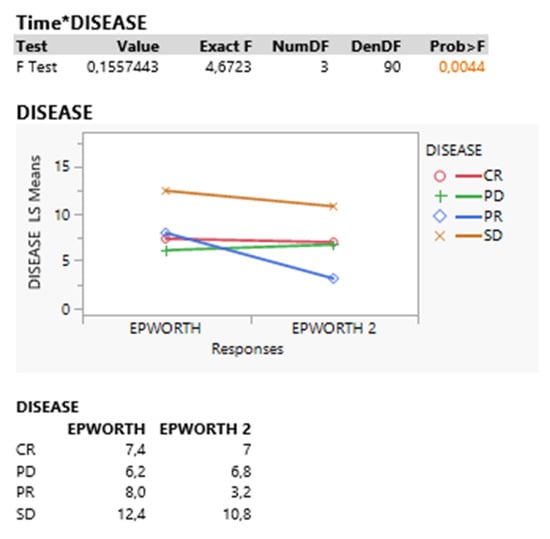 On the contrary, the time*disease interaction signals a significant effect (p = 0.004) vividly demonstrated in the following interaction plot. It appears that the main cause of disease influence derives from the decreasing SD and mainly PD physical conditions at post treatment time or Epworth response, Figure 2.