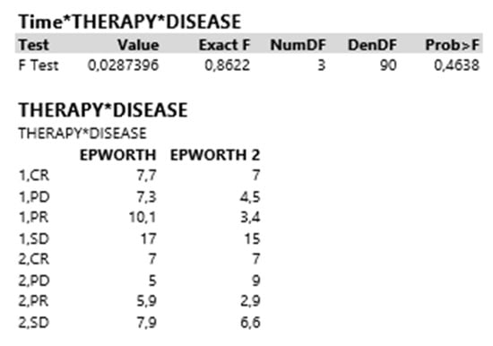 In conclusion, the different types of therapy did not affect the Epworth response before and after treatment in the predefined time intervals neither when combined with progressive disease. The disease progress substantially influenced the Epworth response in the post treatment period and uniquely was affected by SD or PD conditions.
