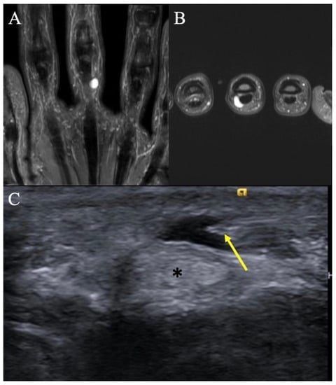 Due to its higher-contrast resolution, MRI is the most sensitive and specific imaging modality for the diagnosis of infectious tenosynovitis []. Fluid accumulation within the tendon sheaths and synovial hyperplasia can be detected on MRI. Especially in tenosynovitis caused by Mycobacteria tuberculosis, a nonspecific “rice-bodies” appearance may be seen. With gadolinium on contrast-enhanced MRI, the paratendinous contrast enhancement caused by diffuse inflammation can be demonstrated. In addition, CT with contrast demonstrates tendon thickening, edema, and abscess.