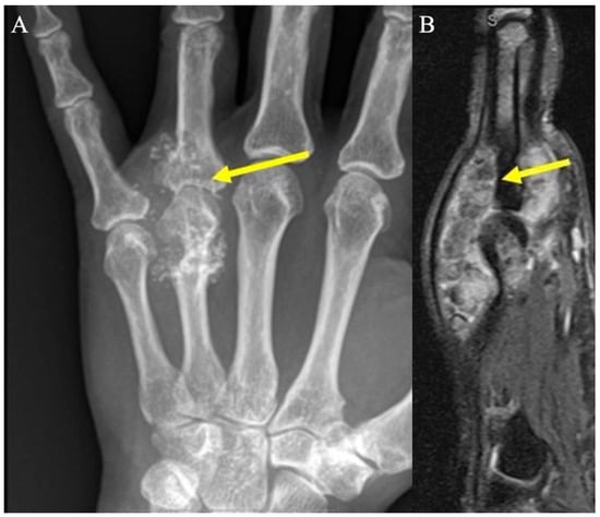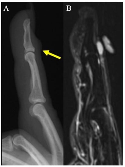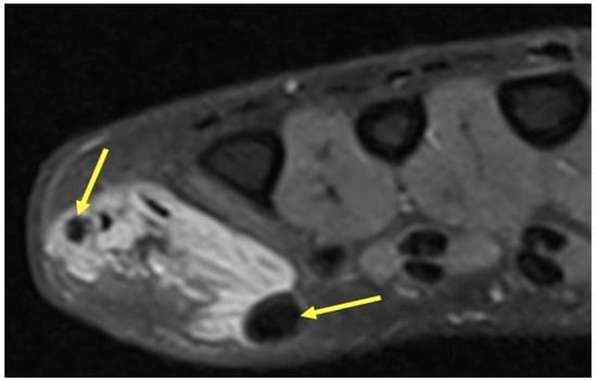 Epithelioid sarcomas, synovial sarcomas (Figure 13), and undifferentiated pleomorphic sarcomas represent the most common type of malignant soft-tissue sarcomas of the hand in adults []. Acral myxoinflammatory fibroblastic tumor is a lower-grade sarcoma with a predilection for the hand and fingers (Figure 14). Typically, STS presents as a painless growing mass; patients may attribute incidental trauma to the area.
