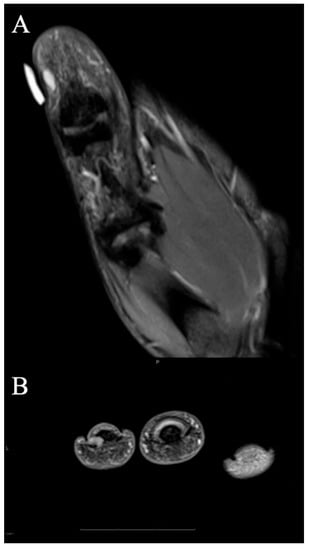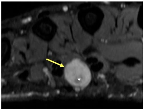 Plain radiographic imaging of a glomus tumor is usually unremarkable. Rarely, cortical scalloping of the underlying phalanx can be found in long-standing cases. Ultrasound studies typically show hypoechogenicity, internal vascularity on Doppler interrogation, and tenderness to direct sonographic palpation with the ultrasound prob [,]. On MRI, glomus tumors manifest as smooth-contoured lesions, with low or intermediate signal on T1W images, with hyperintensity on T2W images (Figure 7) []. Because of the vascularity of the lesions, these lesions display characteristic uniform and avid contrast enhancement.