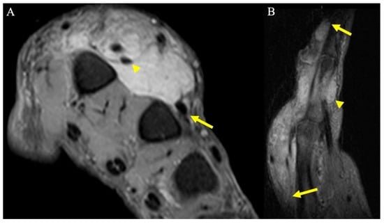 A 67-year-old man with soft tissue mass of the hand. (A) Axial fat-suppressed PD MRI shows a large hyperintense soft-tissue mass in the dorsum of the hand, centered over the second and third metacarpals, and encasing the index finger extensor tendons (arrowhead), and thin tails of infiltrating tumor partially encasing middle finger extensor tendon (arrow). (B) Sagittal fat-suppressed PD MRI highlights the extent of the infiltrative mass along the index finger dorsally (arrows), as well as smaller volar components (arrowhead). Initially, this was thought to be an abscess but was later revealed to be acral myxoinflammatory fibroblastic sarcoma after incisional biopsy, and ultimately required second and third ray amputations to achieve wide negative margins.