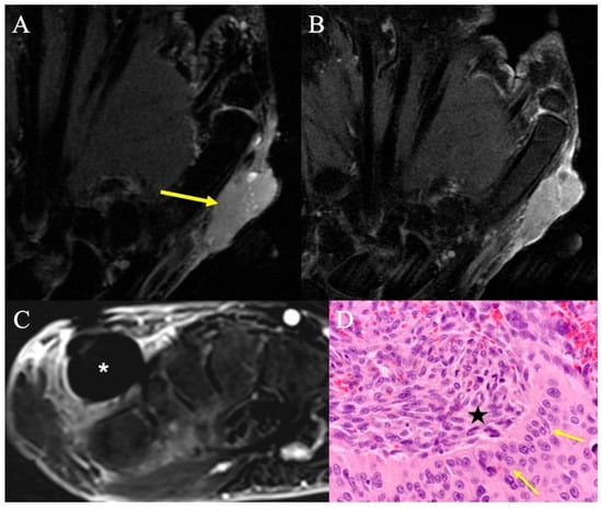Carcinosarcoma. (A) Coronal fat-suppressed T2-weighted image showing a homogenous mass nearly isointense to muscle, radial to the first metacarpal (arrow). (B) Coronal contrast-enhanced fat-suppressed T1-weighted imaging shows mildly heterogeneous enhancement of this solid mass that involves the skin and subcutis. Biopsy confirmed carcinosarcoma of the hand. (C) Contrast-enhanced fat-suppressed T1-weighted image with subtraction from routine surveillance MRI 12 months after surgical resection revealed a 1.5 cm round mass (*) in the dorsal aspect of the surgical resection bed; despite lack of central enhancement, the morphology and timing of the imaging findings raised concern for recurrent disease, which was subsequently proven by percutaneous needle biopsy. (D) High-powered H&E showing the sharp demarcation between the squamous cell component (arrows) and spindle-shaped cells (*) characteristic of carcinosarcoma of the hand.