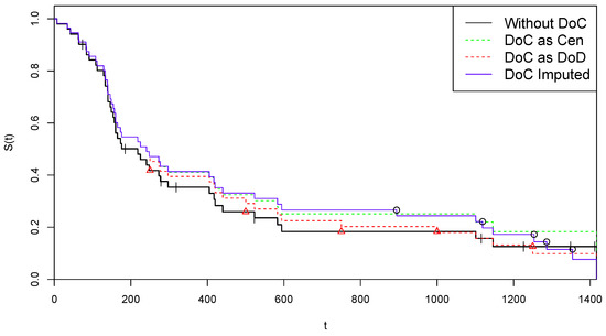 It is assumed that the censored observations do not contribute additional information to the estimation, which is the case if censoring is independent of the survival process. If the time points are given, it was already shown in the original paper [13] that (1) is a maximum likelihood estimator. Obviously , the last time point in the observed sequence. For our purposes, it is important to distinguish two cases, depending on whether at there is a DoD or a Cen.