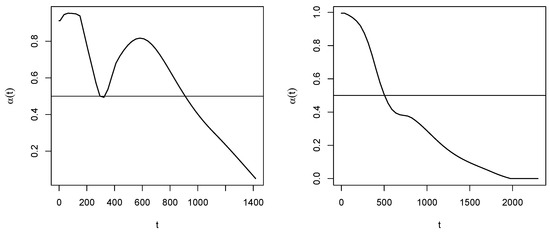 The estimation of can be realized non-parametrically by the well-known Kaplan–Meier product-limit estimator [13]. If we denote by: