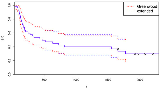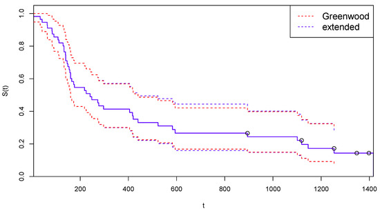 To save space, data is presented, as in the book, in compact form, with the + sign representing censoring. The conversion of these data into the form of a two-component vector is immediate. There are patients, with 43 DoD events and 8 Cen events. The final time point is 1417 days after the beginning of the study, and a DoD is observed on that date. Therefore we are in a complete death-observations case, with . The corresponding KM estimate of the survival function is illustrated by the black line in Figure 1.