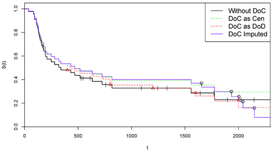 where both the observed and the estimated virtual lifetimes are kept the same, while all the status indicators are reversed. Running the KM estimator on the set , one obtains the so-called reverse Kaplan–Meier survival curve , which refers to Cen instead of DoD endpoints, and provides the new conditional expectations , given , of the virtual lifetimes. We then choose to derive the adjusted estimates , for , as: